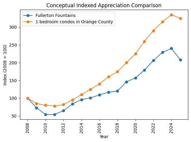 The chart above compares Fullerton Fountains with one-bedroom condos across Orange County using an indexed approach. By starting both markets at the same point, the focus shifts away from dollar amounts and toward how quickly each market changed over time. What’s clear is that both experienced the same housing cycles: the crash, the recovery, and the post-2020 surge. The difference wasn’t timing, but intensity.